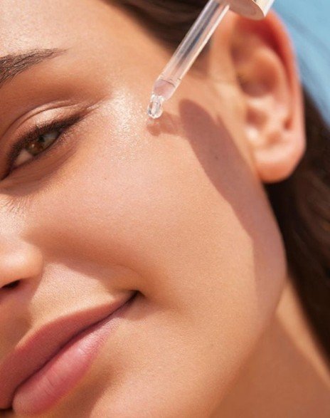 Close-up of woman applying anti-ageing serum with dropper as part of morning or night skincare routine.